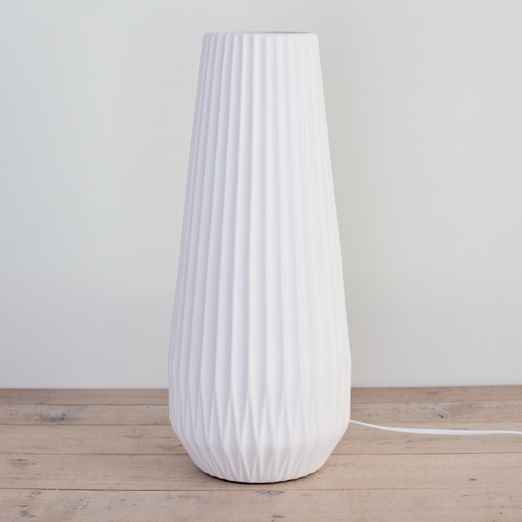 19 x 19 x 45 cms. This electric (plug in) table lamp is made from unglazed, pure white porcelain. When in use, it's slightly transparent, with light glowing through the fold patterns. It takes one 8W energy saver bulb.